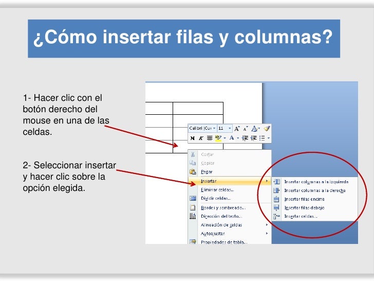 Para agregar filas, haga clic en Insertar arriba o Insertar debajo. Para agregar columnas,haga clic en Insertar a la izquierda o Insertar a la derecha. Sugerencia: Para agregar una fila al final de una tabla, haga clic en la última celda de la última fila y presione la tecla TAB.